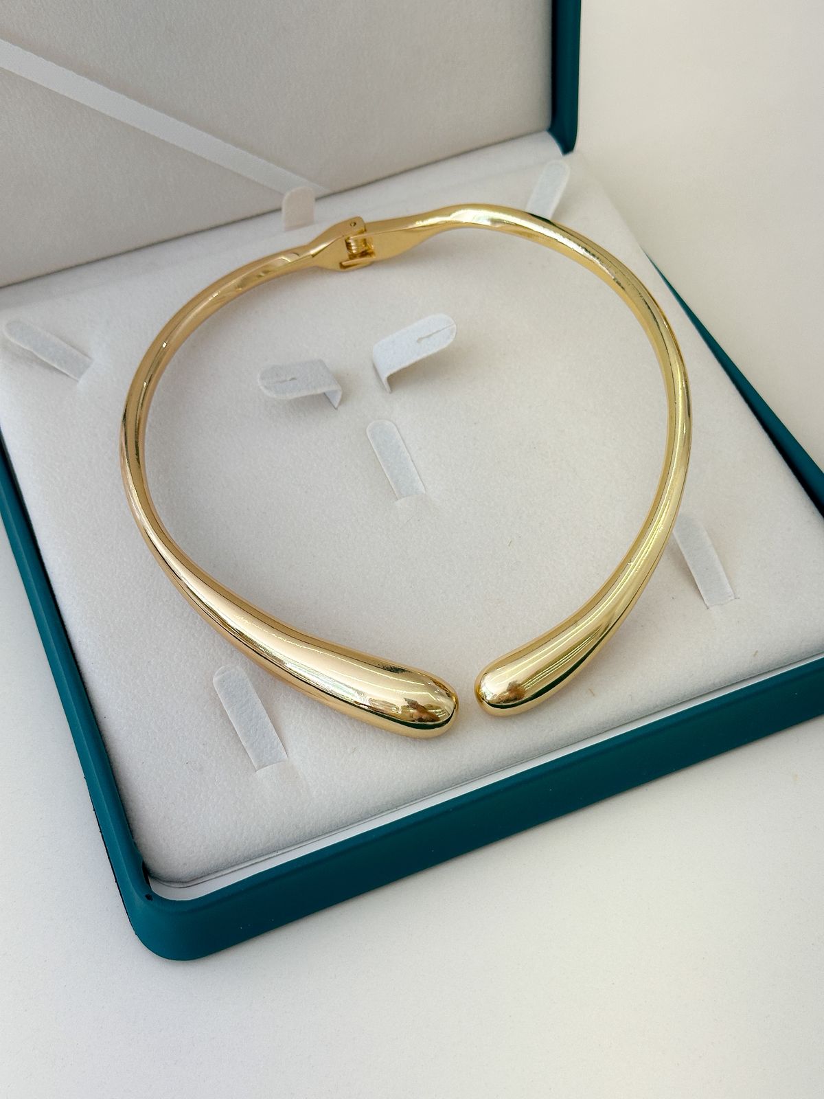 Seu formato rígido e levemente anatômico valoriza o colo com delicadeza, enquanto as extremidades arredondadas adicionam um toque contemporâneo e sofisticado. O banho folheado a ouro garante brilho intenso e acabamento impecável, proporcionando uma joia versátil e atemporal.