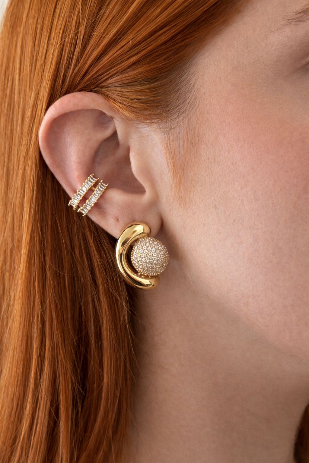 Este brinco folheado a ouro combina design moderno e elegância atemporal. Seu formato orgânico envolve delicadamente uma esfera central cravejada com micro zircônias, criando um efeito luminoso e sofisticado que valoriza qualquer produção.