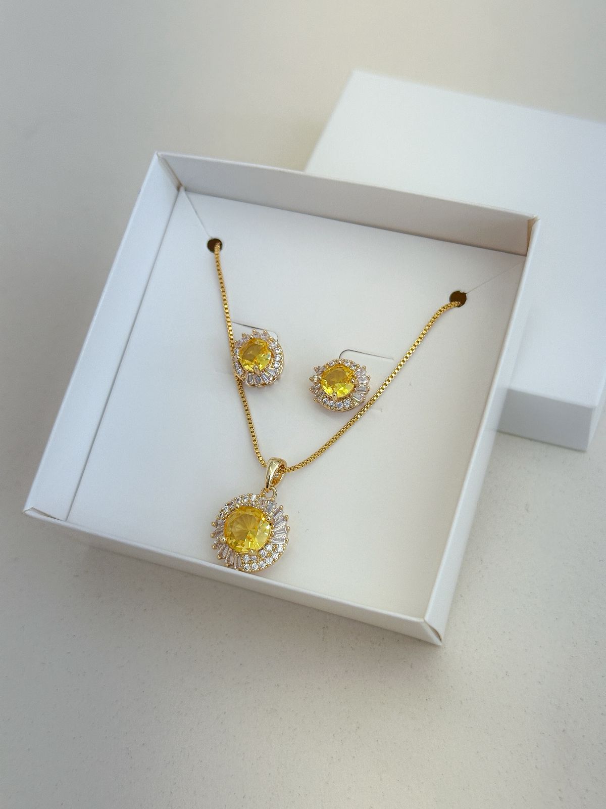 Este conjunto banhado a ouro é a escolha perfeita para quem busca sofisticação com um toque clássico. Composto por colar e brincos, apresenta um design delicado com pedra central em tom amarelo, envolvida por zircônias cravejadas que proporcionam brilho intenso e acabamento refinado.