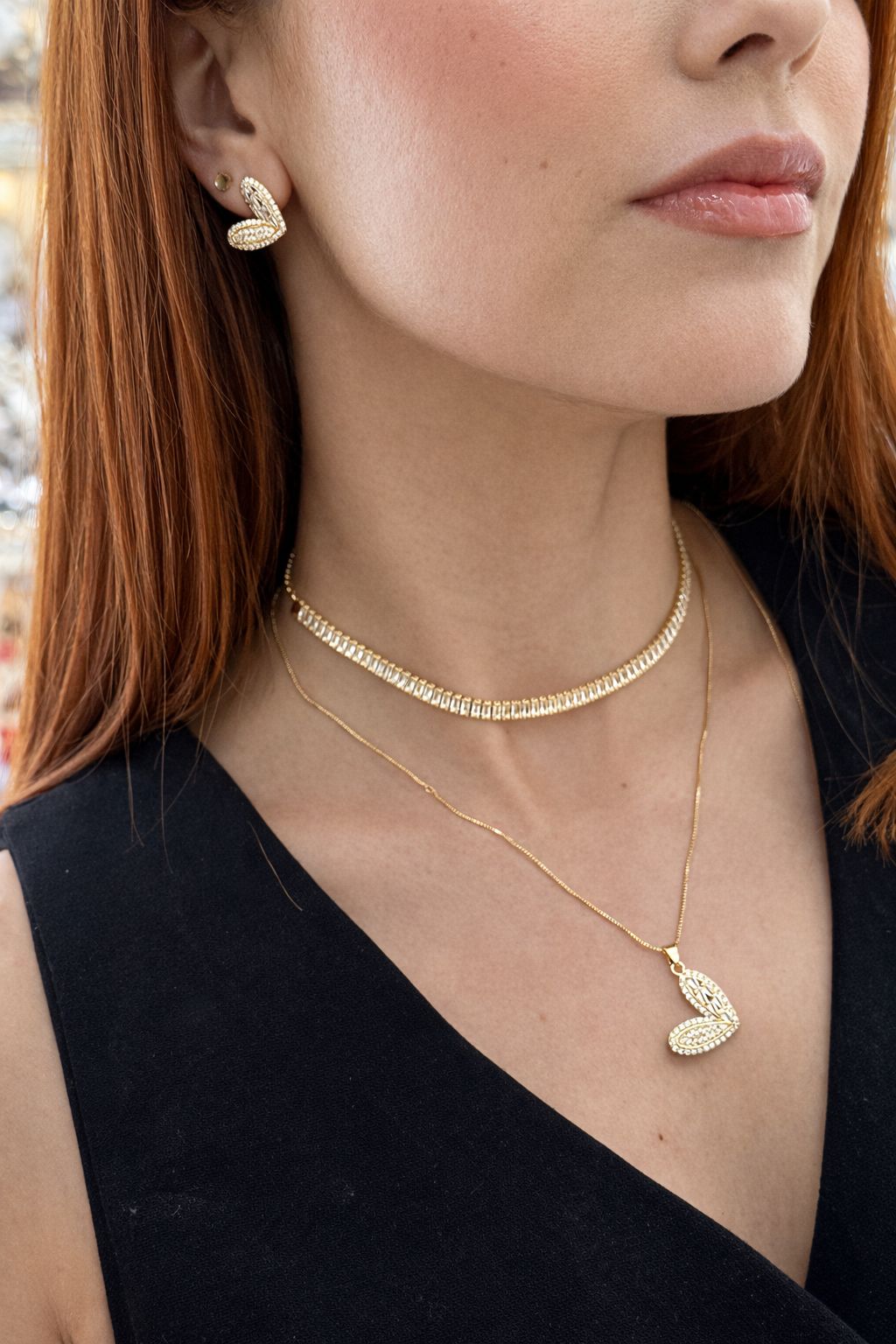 Este conjunto folheado a ouro é a união perfeita entre romantismo, sofisticação e modernidade. Composto por colar e brincos em formato de coração, seu design delicado é enriquecido por micro zircônias cravejadas e detalhes em navetes, que proporcionam um brilho intenso e acabamento refinado.